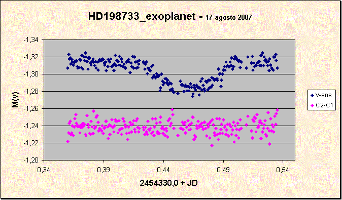 L'11 settembre 2007 si è ottenuto un risultato analogo con il transito del pianeta TRES1, dove la caduta di luce è risultata essere ancora più esigua: soli 19 millesimi di magnitudine. Seguono le due curve di luce: in blu la curva di luce della stella occultata dal pianeta, in rosso la luminosità costante di una stella di campo presa come riferimento.